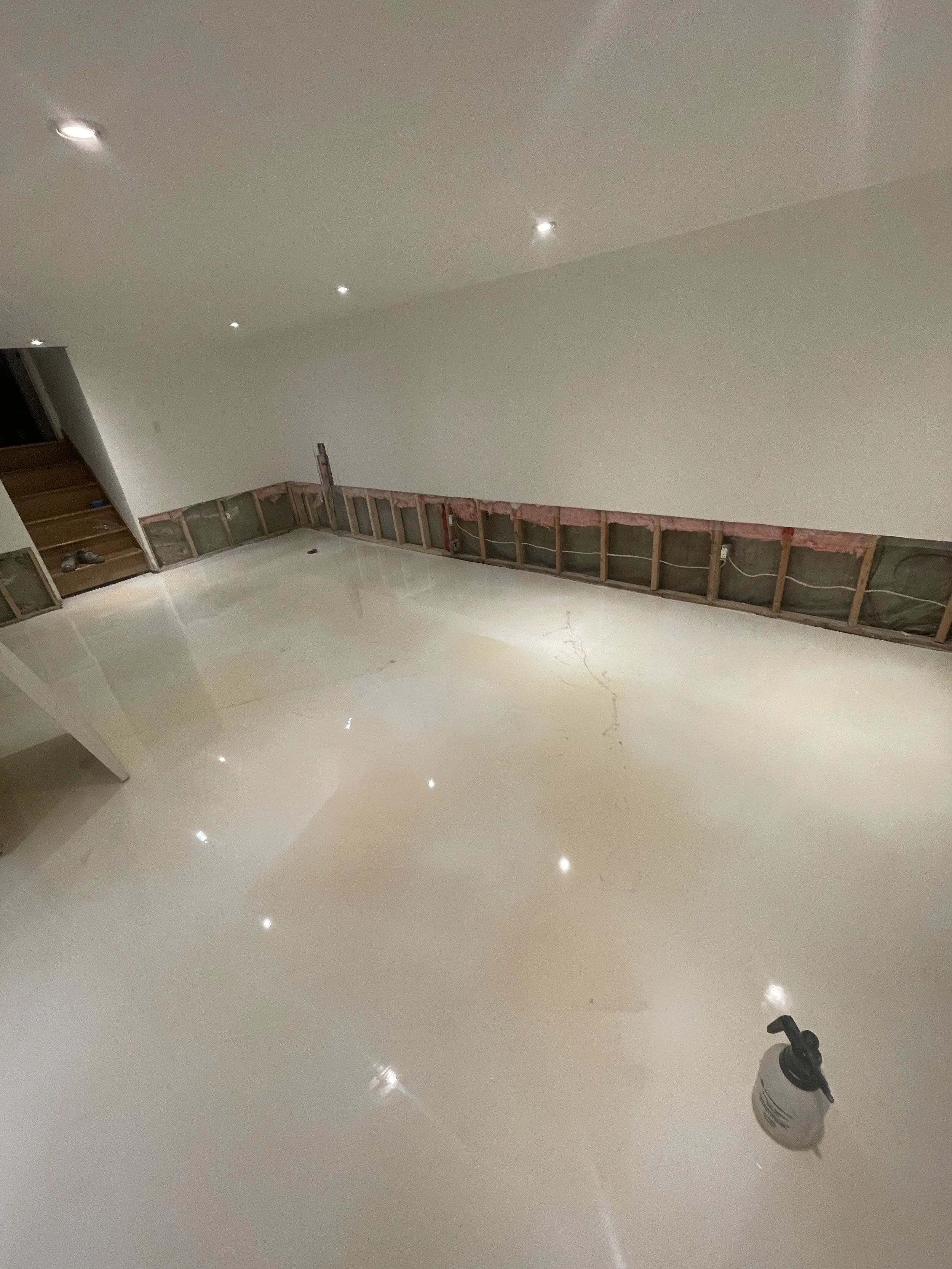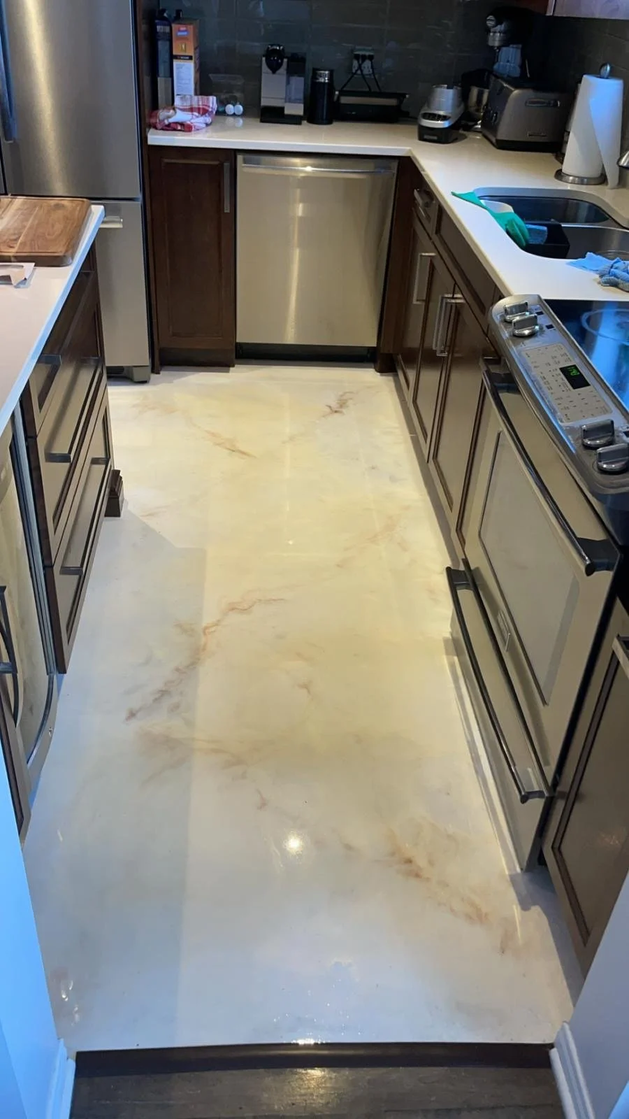 Metallic epoxy is an advanced resin flooring system that combines the durability of epoxy with a striking metallic pigment. This floor coating creates a seamless, glossy finish that can mimic the appearance of natural stone, making it an excellent choice for modernizing any space without the need to remove existing tiles, thus offering cost savings and effective moisture resistance.